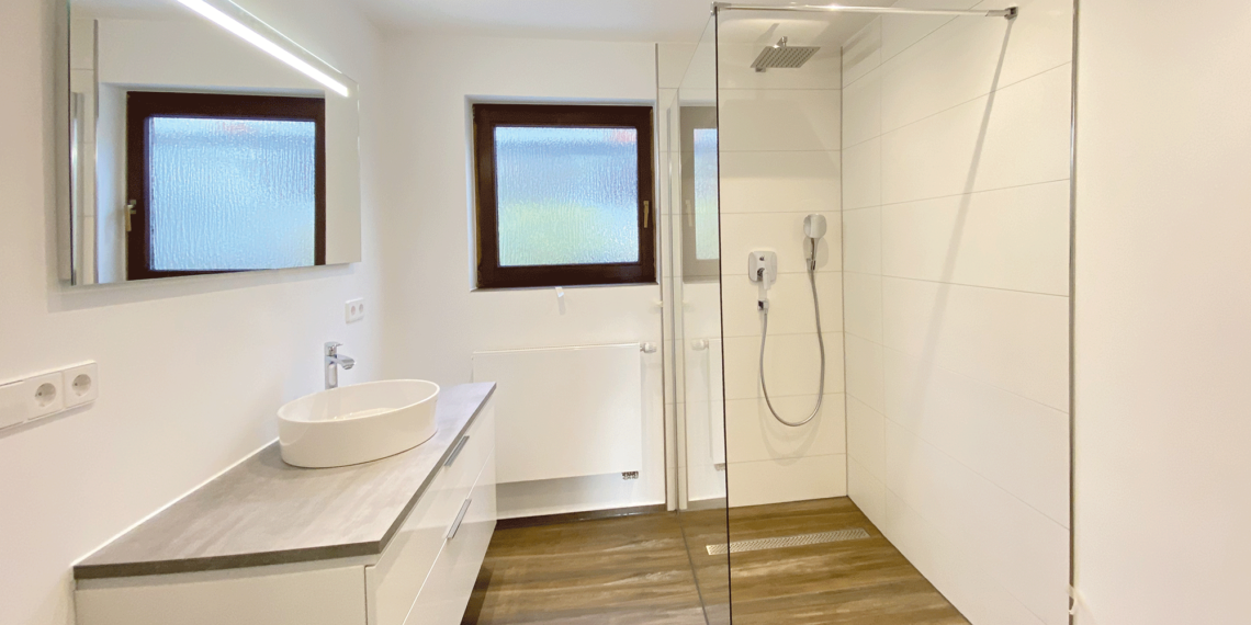 Gesagt, geplant, getan: raus mit Wanne und Klo. Raus mit Böden in Bad, WC, im Wohnbereich und Küche. Bad und Toilette neu installiert, Fliesen dunkel, Holzbohlenoptik und wie gewünscht die große, bodenebene Dusche. Glänzende Armaturen. Aufgedreht und losgeträllert. Funktionell, in modernem Design Waschtisch und Waschbecken. Integrierte Leuchten im Spiegel. Da zwinkert man sich gerne zu. Und man fühlt sich wohl dabei.