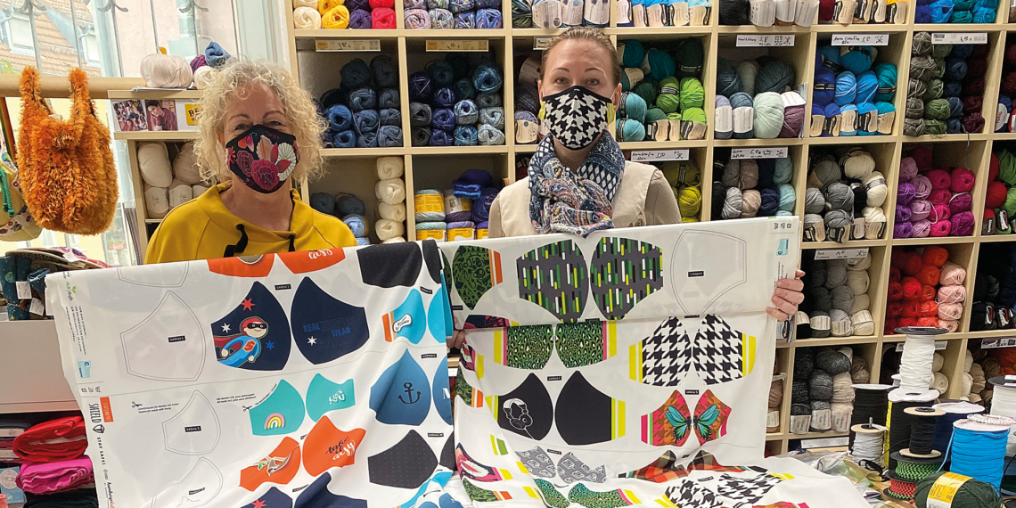 Wer nicht selbst nähen kann oder möchte, kann sich die Stoffmasken mit Printmotiven von Olga Halatci-Ils und Susanne Eichhorn anfertigen lassen oder in der Auswahl der schicken Eigenkreationen von Unikat fündig werden. Diese nähen die Schneiderinnen aus speziellen Maskenstoffen der „stay healthy“ Serie der Firma Hilco und Baumwollpopeline – eine bestimmte Gewebestruktur – mit Krawattendesigndrucken von Hemmers Itex.