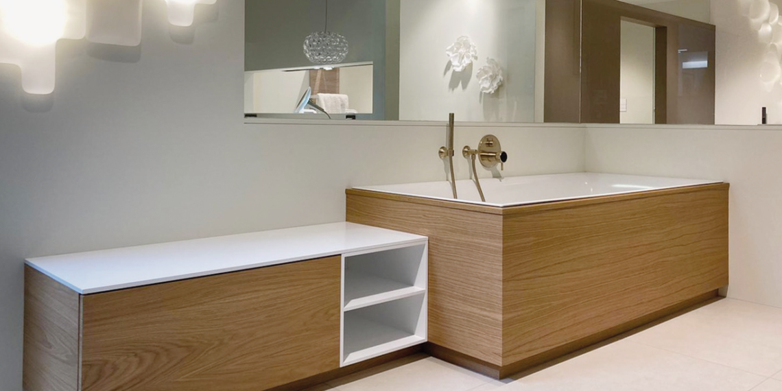 „Europäische Eiche, seit einigen Jahren ein absoluter Trendsetter, harmoniert einzigartig mit weißem Mineralwerkstoff“, sagt Marcus Fischer. So ist die mit Holz verkleidete Badewanne nicht nur eine handgeschreinerte Individualanfertigung der Schreinerei Fischer, sondern noch dazu ein echter Blickfang im Badezimmer. „Diese schlichte Eleganz ergänzen wir mit weiteren handgearbeiteten Möbeln im gleichen Stil: zum Beispiel mit einer Sitzbank mit Regal und Schubkasten, einem hohen Hängeschrank – beide ebenfalls aus Eiche und Mineralwerkstoff – und mit Eiche verkleideten Unterschränken oder Schubkästen mit Eichenfronten für Waschbecken. Waschtischkonsolen fertigen wir in allen erdenklichen Maßen, und Spiegelschränke passen wir an die jeweilige Raumsituation und Ihre Wünsche an, hier z. B. mit einer umlaufenden Lichtkorona für eine stimmige Beleuchtung“, ergänzt Heike Schmid.