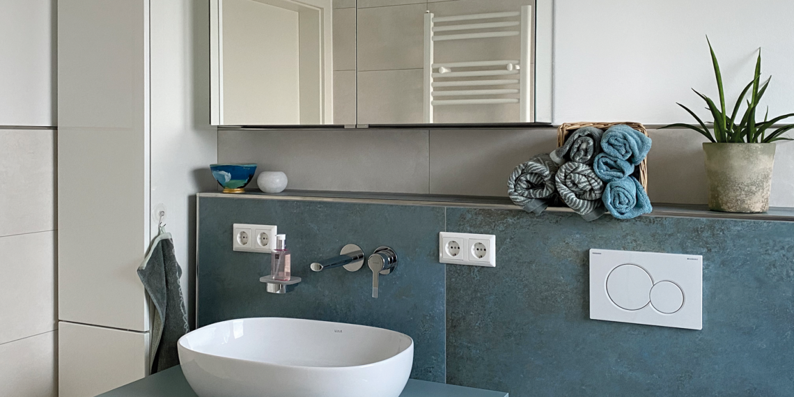 Die Bauherren wollten alles aus einer Hand und fachmännisch ausgeführt haben. Ein erster Vorort-Termin wurde vereinbart, die Wunschvorstellung aufgenommen und auf Machbarkeit geprüft. Auf Empfehlung der HandwerkerGilde wurden dann die Durchgänge zeitgemäß vergrößert, neue Zugangstüren eingebaut und das Badezimmer in nördlicher Richtung vergrößert, um für eine bodenebene, begehbare Dusche Platz zu schaffen. Großformatige blaugrüne Fliesen wurden in Kombination mit cremefarbenen nahezu fugenlos verlegt und dazu passend ein Boden in heller Dielenholzoptik gewählt.