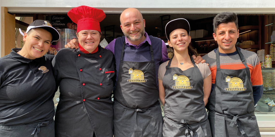 Bei La Terrazza stehen italienische Klassiker wie hausgemachte Pasta, aber auch Gourmetpizzen und sogar glutenfreie Pizzen auf der Speisekarte – alles, was zum kulinarischen Geschmack eines Italienurlaubs dazugehört. Und die etwa 30 Eissorten aus eigener Herstellung lassen das Herz aller Eisschlecker höherschlagen. „Neben Klassikern wie Schokolade, Vanille und Fruchteis gibt es bei uns auch ausgefallenere Kreationen. Alle Eissorten stellen wir aus frischen Zutaten selbst her“, so Inhaber Stefano Pirelli. „Außerdem suchen wir noch Mitarbeiter zur Verstärkung im Service und an der Theke.“