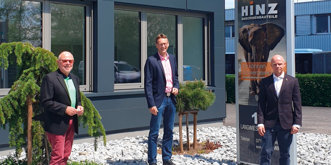 Thomas Csazsar, Verbandsvorsitzender und Brackenheims Bürgermeister, besucht die Inhaber-Familie König mit Ulrich, Doris und Markus der Firma Hinz. Sie siedelte mit ihrem Unternehmen „Hinz Maschinenbauteile“ vor fast 40 Jahren (1985) als eines der ersten Betriebe mit einem Teil ihrer Firma von Ditzingen-Schöckingen ins damals neu erschlossene Gebiet Langwiesen an.