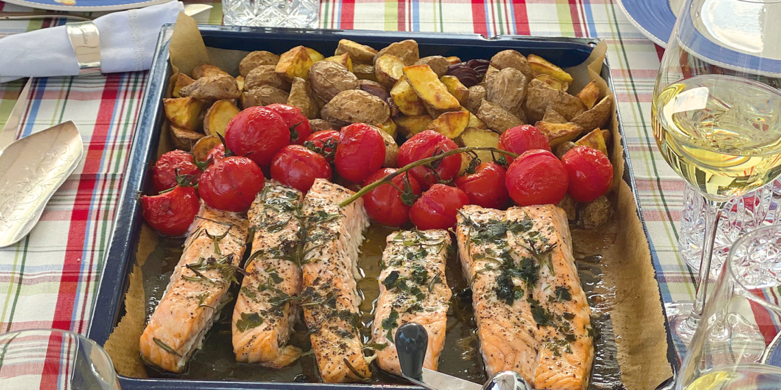 Das Ganze kommt in den auf ca. 160 Grad vorgeheizten Backofen. Dort lasse ich alles etwa 20 Minuten garen, hole das Backblech nochmals raus und mache Platz für die Lachsfilets, die lege ich dazu.