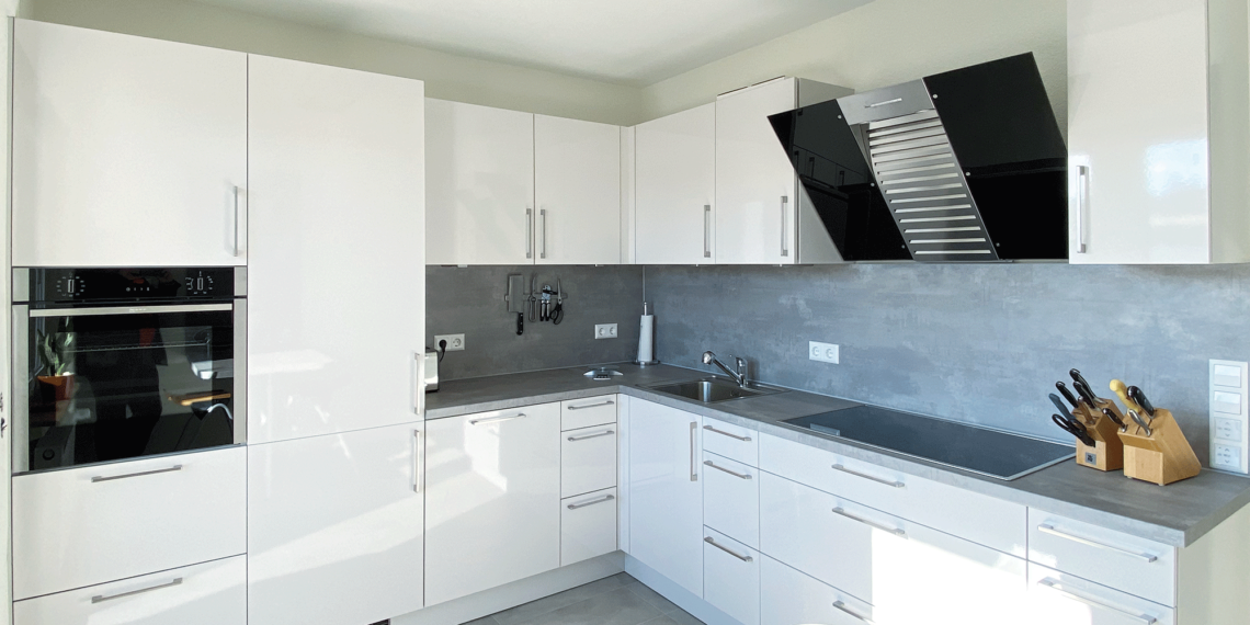 Die kompletten Wohnräume wurden, inklusive Bad, Toilette und Küche, einheitlich gefliest, die Wände in einem Cremeton, die Decke weiß verputzt. Im Flur wurde die Decke abgehängt und mit LED- Einbauleuchten versehen. Neue, weiße Holztüren und moderne, transparente Glastüren sorgen für eine helle und luftige Atmosphäre. Die neu eingebauten Fenster halten im Winter die Wärme im Raum und liefern im Sommer ausreichend Belüftung. Die elektrischen Rollläden verfügen über eine sonneneinstrahlabhängige Steuerung. Die großräumige Küche mit Sitzplatznische hat Zugang zum Balkon. Sie ist ausgestattet mit Spülmaschine, Backofen, Induktionsherd und ergonomisch-stoßfreiem Dunstabzug. Wenn mehr Gäste kommen, wird das separate Esszimmer genutzt.