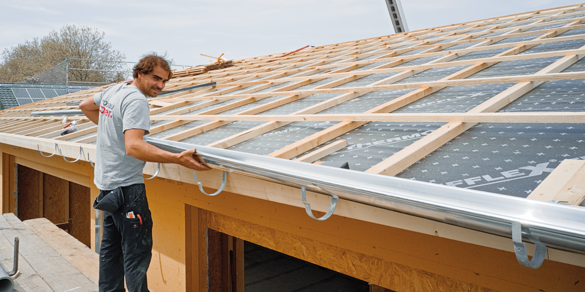 Doch danach ist noch nicht Schluss für Holzbau Stopper. „Wir montieren natürlich auch noch die Dacheindeckung“, ergänzt Johannes Stopper, „in diesem Fall aus Trapezblech, und auch die Dachrinne und Regenrohre. Das garantiert einen schnellen und reibungslosen Ablauf.“