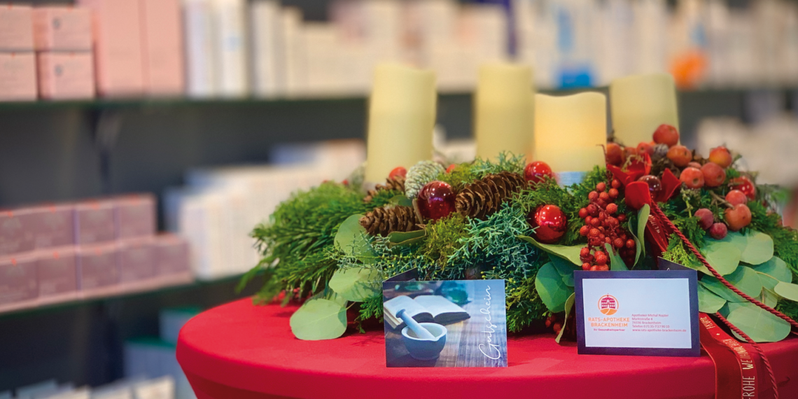 „Seien Sie versichert, dass wir jederzeit alles tun, um unsere Kunden stets bestens mit den notwendigen Dienstleistungen und Arzneimitteln zu versorgen. Für Sie, Ihre Familien und Freunde bieten wir gerne interessante Geschenksets und Gutscheine an und wünschen Ihnen eine stimmungsvolle Adventszeit, frohe Weihnachtstage und einen guten Start in ein gesundes, friedvolles neues Jahr 2023“, so Ihr Apotheker Michal Najder und die Teams der Fleiner Apotheke und der Rats-Apotheke Brackenheim.