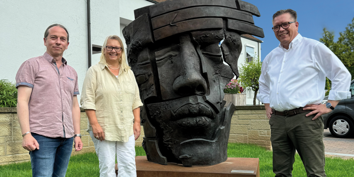 Prominent, alle Blicke auf sich ziehend thront er neben dem Güglinger Rathaus, der „African King“ von Gunther Stilling. Bürgermeister Ulrich Heckmann freut sich, dass die beeindruckende Skulptur des Güglinger Künstlers nun an ihren Entstehungsort zurückkehrt: „Ein König kehrt heim – von nun an ist der ,African King‘ auf der Grünfläche östlich unseres Rathauses zuhause.“
