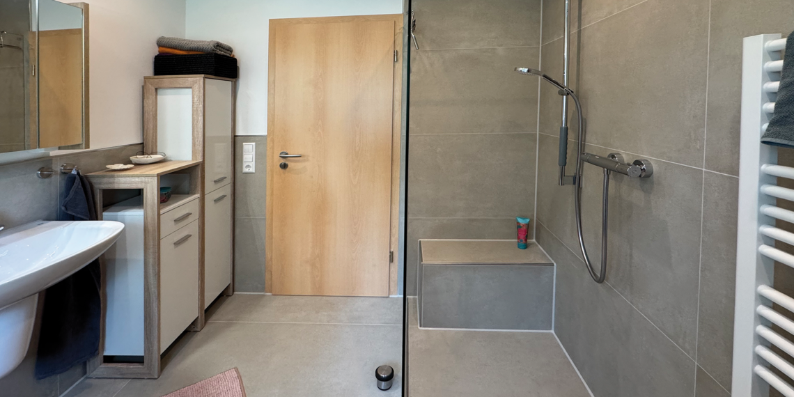 „Meine Nachbarin gab mir den Tipp mit der HandwerkerGilde Brackenheim. Und der war Gold wert. Vom ersten Gespräch über das Angebot und der schnellen Umsetzung lief alles wie am Schnürchen“, so die Bauherrin. Im Badezimmer wurden der Boden und die Wände halbhoch mit großflächigen Naturfeinsteinzeugplatten gefliest. Eine begehbare bodenebene Dusche sorgt mit großen Glaswänden für ein gutes Raumgefühl, eine innenseitige Abmauerung für bequeme Sitzgelegenheit.