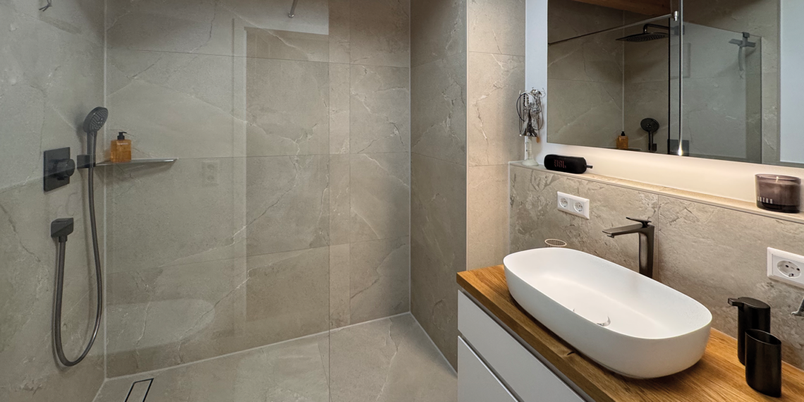 „Für unsere Renovierung hatten wir mit Herrn Eckert von der HandwerkerGilde einen straffen Zeitplan gestrickt. In vier Wochen sollte alles erledigt sein.“ Und los ging’s: Die alte Küche, Bad, Toilette inklusive Installationen wurden entfernt. Nach Vorinstallation und Elektroinstallation wurden Dusche, Waschtisch und separater Waschraum mit Gästetoilette gefliest.