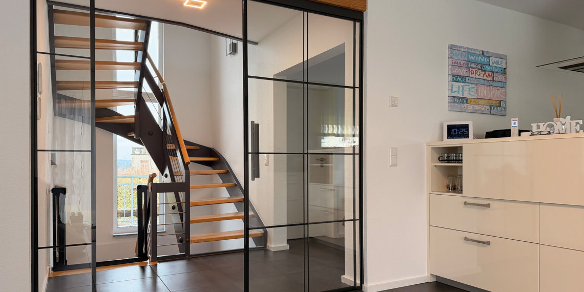 Zunächst wurde ein bestehender Windfang zurückgebaut und fehlende Bodenfliesen akkurat eingepasst. Zum Raumkonzept passend wurden dann zwei zentrale, maßgefertigte Loft-Elemente im Industrial Look als Raumtrenner eingebaut. Im Erdgeschoss wurde so der Wohn-Essbereich vom Eingangsbereich und Treppenhaus abgetrennt, ein bestehender massiver Leimbinder integriert, Lichtschalter nach innen versetzt sowie der Durchblick aufgrund der Glas-Metallkonstruktion erhalten. Im Dachgeschoss wurde als Steigerung ein raumhohes Loft-Element eingepasst und so zusammen mit dem bestehenden Treppenhaus ein architektonisches Highlight geschaffen.